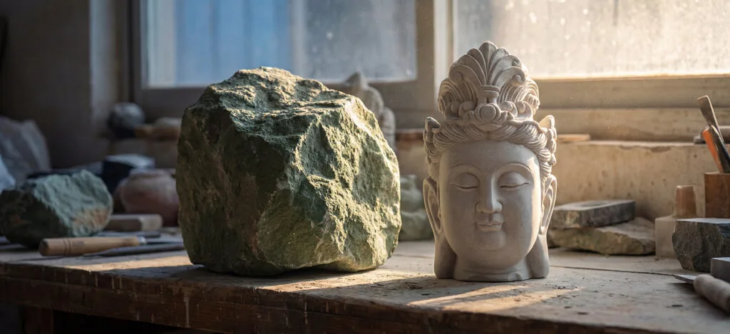 We use materials that age gracefully—raw grey stone, smoothed by time and hand, designed to be held, touched, and cherished.